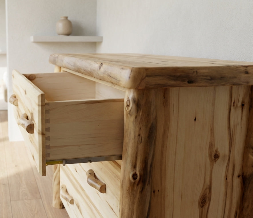 Experience the perfect blend of rustic charm and modern functionality with our Rustic Log 9 Drawer Dresser in Flat Front. Crafted from premium aspen solid wood, this custom-made dresser is designed to provide durable and spacious storage while adding a timeless farmhouse touch to your bedroom. With expert craftsmanship and smooth operation, it's built to last and enhance your bedroom organization.