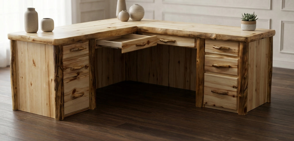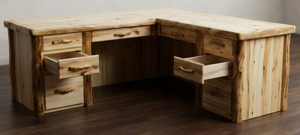 Crafted from solid aspen wood, this L-shaped desk provides ample surface area for multitasking and organization.